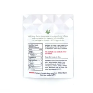 | Ingredients | Sugars (Corn Syrup, Sugar from Beets), Water, Gelatin, Citric Acid, Pectin, Coconut Oil, Canola Oil, Cannabis Extract, Carnauba Wax, Dextrose, Maltodextrin, Natural and Artificial Flavours, FD&C Red 40 Lake, FD&C Blue 1 Lake, FD&C Yellow Lake, Magnesium Stearate |