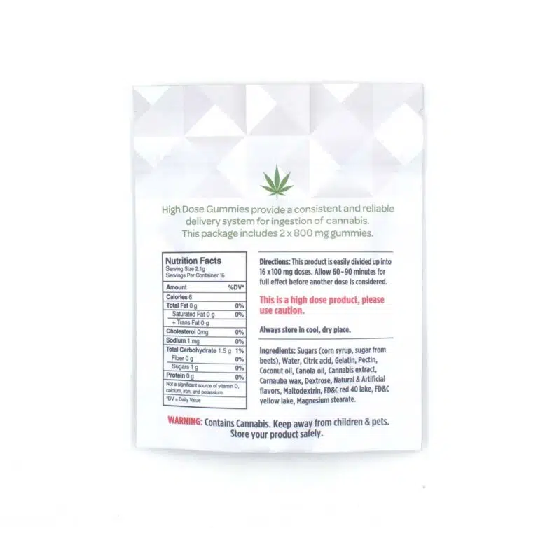High Dose is an edibles company based in British Columbia that offers an amazing lineup of gummy products. They currently offer three fruit gummy packs that come in indica, sativa or CBD each with their own unique fruity flavours. Their gummies are great for both recreational and medicinal users. Each package is airtight and resealable. Each pack contains a total of 200mg/800mg/1600mg of THC/CBD. The 200mg contains 1 large gummy piece that is dividable into 8 x 25mg THC doses. The 800mg contains 1 large gummy piece that is dividable into 8 x 100mg THC doses. The 1600mg contains 2 large gummy pieces that are each dividable into 8 x 100mg THC pieces.
