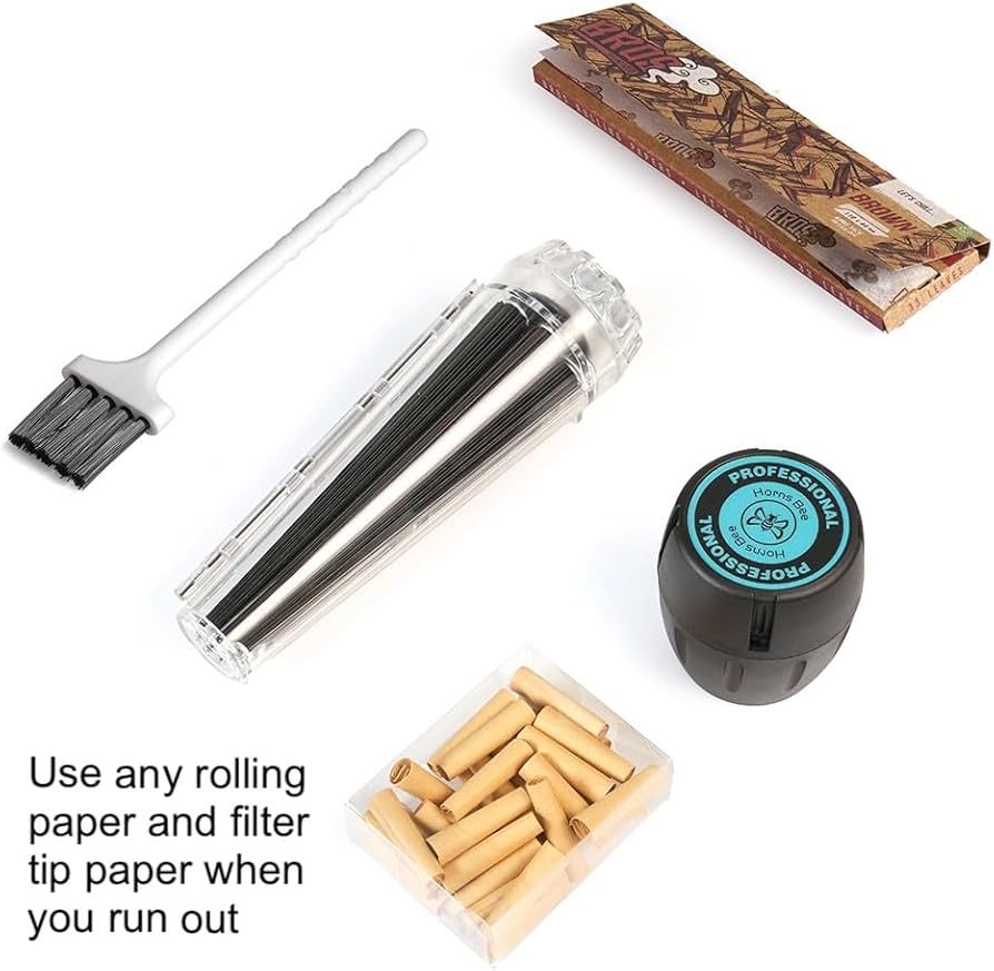 - All-in-One Accessory Kit – Comes with a rolling machine, grinders jar, brown papers, and tips—everything you need for consistent, mess-free rolling.