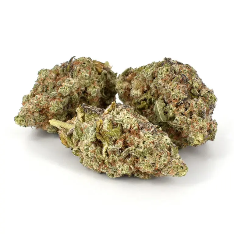 • Dense, cone-shaped nuggets with hues of purple and light green under a heavy layer of white trichomes